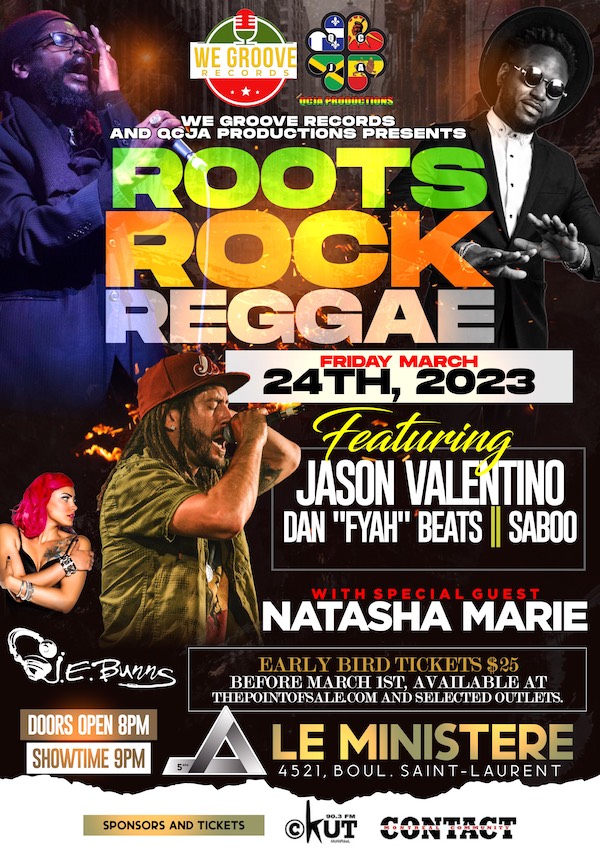 Roots, Rock, Reggae a celebration of music featuring the Rastafari Roots music of Dan Fiyah Beats, the Dancehall Rock of Saboo, and the Sweet Reggae sounds of Jason Valentino. Special guests Natasha Marie and Nodly round out the night, with music by J.E. Bunns.