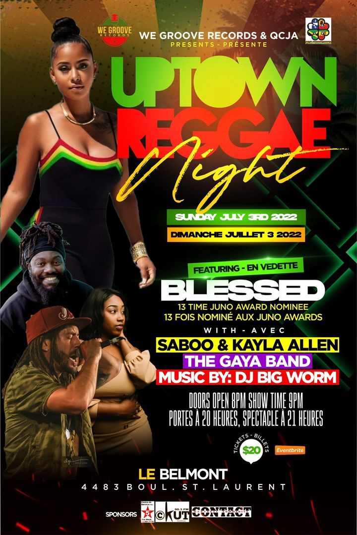 We Groove Records et QCJA Productions présentent Uptown Reggae Night, avec Blessed, nominé 12 fois aux Juno Awards, Saboo et Kayla Allen, accompagnés du Gaya Band, et DJ Big Worm.